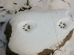 La queue courte se termine par un manchon noir. Les jambes sont longues et les pieds volumineux en comparaison du reste du corps. Il s'agit d'une adaptation au déplacement dans la neige : les longues pattes permettent de se dégager plus facilement dans un épais manteau neigeux[5],[6]. Du fait de ses pieds larges, le Lynx boréal exerce une pression sur le sol trois fois plus faible que celle du Chat sauvage (Felis silvestris)[Note 1],[5]. Par conséquent, le Lynx boréal s'enfonce moins dans la neige, comme s'il portait des raquettes[6] et marche silencieusement[5]. Les empreintes des pattes antérieures font de 5 à 7,5 cm de largeur et de longueur et celles de la patte postérieure 4,5 à 6 cm de longueur et 5 cm de largeur[7].