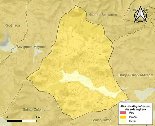 Le retrait-gonflement des sols argileux est susceptible d'engendrer des dommages importants aux bâtiments en cas d’alternance de périodes de sécheresse et de pluie[33]. 93,4 % de la superficie communale est en aléa moyen ou fort (59 % au niveau départemental et 48,5 % au niveau national)[Carte 3]. Depuis le , en application de la loi ELAN, différentes contraintes s'imposent aux vendeurs, maîtres d'ouvrages ou constructeurs de biens situés dans une zone classée en aléa moyen ou fort[Note 7],[34].