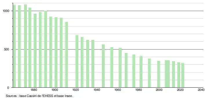 L'évolution du nombre d'habitants est connue à travers les recensements de la population effectués dans la commune depuis 1861. Pour les communes de moins de 10 000 habitants, une enquête de recensement portant sur toute la population est réalisée tous les cinq ans, les populations de référence des années intermédiaires étant quant à elles estimées par interpolation ou extrapolation[41]. Pour la commune, le premier recensement exhaustif entrant dans le cadre du nouveau dispositif a été réalisé en 2008[42].