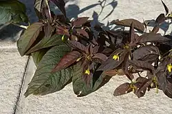 Les feuilles sont opposées, portées par un pétiole long de 5 à 60 mm et portant des cils bien visibles de longs de 0,6 à 2 mm[4]. Chaque feuille est simple, verte, sauf chez la variété 'Firecracker' dont les feuilles sont partiellement ou entièrement teintées de pourpre. Le limbe lancéolé mesure de 4 à 15 cm de long pour 1,5 à 6,5 cm de large[4]. La bordure de la feuille est entière et porte de très petits cils, alors que la surface du limbe est glabre. La nervation est pennée, légèrement arquée.