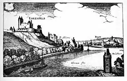 - Les termes muta, en vieux haut allemand, et allemand : Mautturm signifient resp. octroi et tour d’octroi, en l’occurrence : la tour d’octroi d’Ehrenfels.