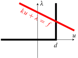 Dans cette section, afin d'établir un cadre (très) simplifié de la mécanique du contact, un seul degré de liberté est supposé, comme indiqué sur la figure 1 : le système idéalisé implique donc le déplacement de la masse . Cette masse est initialement, c'est-à-dire quand le système est au repos (force extérieure ignorée ), séparée d'un mur rigide d'une distance appelée jeu. Sous l'effet d'un force extérieure , la masse est amenée à se déplacer. La raideur , évidemment quantité strictement positive (on observe immédiatement, sur la figure 2, qu'une raideur négative élimine soit l'unicité de la solution, soit son existence), aura tendance à la retenir. Sous cette hypothèse, plusieurs formulations équivalentes sont disponibles. L'exemple considéré est particulièrement simple. Il ne s'agit aucunement d'être exhaustif mais de se concentrer sur la bonne formulation des conditions de contact. Le cadre général, comprenant notamment des cinématiques plus riches, implique rapidement l'usage de notations lourdes qui n'aident pas à la compréhension des concepts.