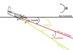 Remarque : l'incidence est l'angle formé entre la corde de référence du profil de l'aile et le vent relatif, alors que l'assiette est l'angle formé entre l'axe de l'avion et l'horizon.