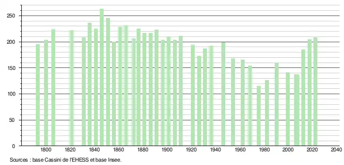 - ↑ Fiches Insee - Populations de référence de la commune pour les années 2006, 2007, 2008, 2009, 2010, 2011, 2012, 2013, 2014, 2015, 2016, 2017, 2018, 2019, 2020, 2021 et 2022.