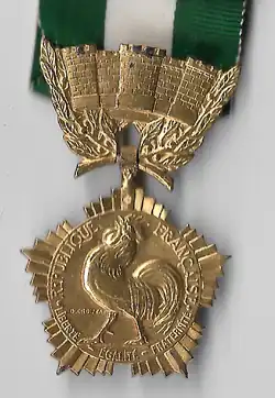 - Sur l'avers : en haut de la médaille, se dessinent des murailles entourées de feuilles de laurier; Sur la médaille, un coq avec les mots gravés « République Française Liberté-Égalité-Fraternité »