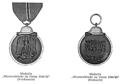 Médaille en zinc, avec sur l'endroit un aigle allemand tenant une croix gammée entre ses serres, et au verso, le texte « Winterschlacht Im Osten 1941/42 », et au-dessous une épée croisant une branche de lauriers de la victoire. Au-dessus de la médaille, le casque de l'armée allemande la reliait au ruban dans un acier poli.