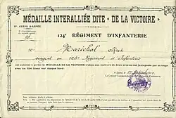 Cette médaille interalliée commémorative de la Première Guerre mondiale, dite « Médaille de la Victoire » a été créée par la loi du .