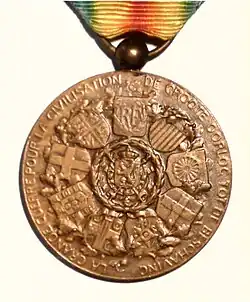 Cette décoration est due au maréchal Foch, commandant en chef des troupes alliées à la fin de la guerre, qui avait proposé la création d’une médaille commémorative commune à toutes les Nations belligérantes alliées. Gravée librement par chaque nation, cette décoration devait toutefois représenter à l’avers une victoire ailée[2] et sur le revers l’inscription traduite dans la langue du pays « La Grande Guerre pour la Civilisation » sur un module en bronze d'un diamètre de 36 mm. Le ruban, identique pour toutes les puissances, figurait deux arcs-en-ciel juxtaposés par le rouge avec, sur chaque bord, un filet blanc.