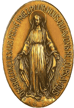- La prière « Ô Marie conçue sans péché, priez pour nous qui avons recours à vous » circule le long du bord de la médaille, entourant la Vierge Marie. « Marie conçue sans péché » évoque le dogme marial de « l'Immaculée Conception », proclamé en 1854 par le pape, et que l'on retrouve lors des apparitions de Lourdes en 1858 : « Je suis l’Immaculée Conception »[14]. Cette prière est l’invocation suggérée pour en obtenir la grâce souhaitée[2].
