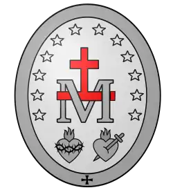 - Au centre, la lettre « M » pour Marie. La lettre entrelace une barre transversale qui soutient le pied de la Croix[11]. Ce « M » entrelacé avec la croix de Jésus rappelle le lien indéfectible qui les unit[7].