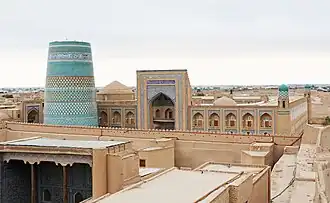 Entrée en iwan de la médersa, avec à gauche le minaret Kalta Minor (minaret court).