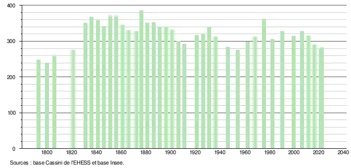 L'évolution du nombre d'habitants est connue à travers les recensements de la population effectués dans la commune depuis 1793. Pour les communes de moins de 10 000 habitants, une enquête de recensement portant sur toute la population est réalisée tous les cinq ans, les populations de référence des années intermédiaires étant quant à elles estimées par interpolation ou extrapolation[15]. Pour la commune, le premier recensement exhaustif entrant dans le cadre du nouveau dispositif a été réalisé en 2006[16].
