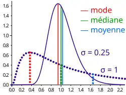 Mode, médiane et moyenne de deux distributions différentes suivant la loi log-normale.
