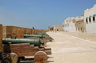 - remparts de plus de 200 m de long, côté atlantique, de style Vauban, avec des plates-formes d'artillerie Sqala de la Kasbah, et Sqala du Port, avec échauguettes, et batterie d'une vingtaine de vieux canons espagnols historiques en bronze du XVIIIe siècle...