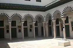 La principale d'entre elles, la mosquée Zitouna, bâtie en 732 au cœur de la médina puis entièrement rebâtie en 864, a aussi été pendant longtemps un important lieu de culture et de savoir en abritant les locaux de l'université Zitouna jusqu'à l'indépendance de la Tunisie[10]. Il accueille encore les cérémonies marquant les principales dates du calendrier musulman auxquelles assiste régulièrement le président de la République. La mosquée El Ksar de rite hanéfite, située en face du Dar Hussein (Bab Menara), aurait été édifiée pour sa part au XIIe siècle[11]. La mosquée de la Kasbah, édifiée entre 1231 et 1235[12], et pratiquant le rite hanéfite depuis 1584, se distingue surtout par la coupole en stalactites précédant le mihrab ainsi que par son minaret qui rappelle celui de la Koutoubia de Marrakech et qui est le plus haut de la ville[11].