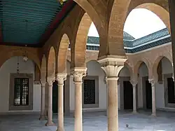 Apparue en Tunisie durant l'époque hafside, à partir du XIIIe siècle, la médersa assure deux fonctions essentielles : l'hébergement des étudiants et l'enseignement qui se déroule dans une salle de prière appartenant à l'édifice. Généralement, la construction des médersas résulte de la générosité des souverains ou de pieux mécènes[21]. Les principales composantes de la médersa sont : une salle de prière qui est l'élément le plus important de l'édifice car affectée à la fois au culte et à l'enseignement, une cour (très souvent encadrée de portiques) qui constitue l'espace autour duquel s'organise la disposition des divers éléments du bâtiment, des cellules ou chambres de petites dimensions destinées au logement des étudiants et enfin une salle d'ablutions occupant généralement un espace réduit de l'édifice[21].