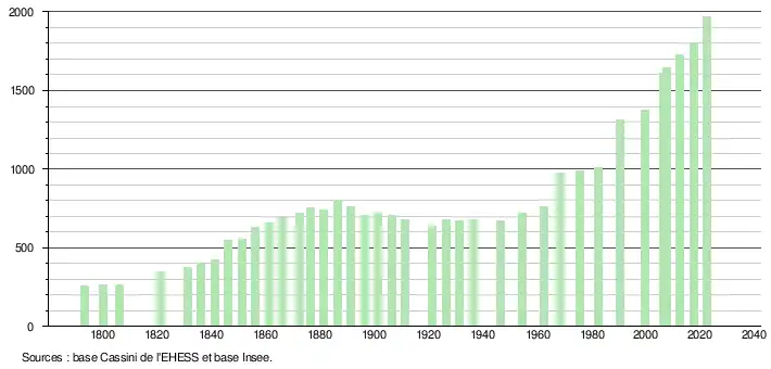 | L'évolution du nombre d'habitants est connue à travers les recensements de la population effectués dans la commune depuis 1793. Pour les communes de moins de 10 000 habitants, une enquête de recensement portant sur toute la population est réalisée tous les cinq ans, les populations de référence des années intermédiaires étant quant à elles estimées par interpolation ou extrapolation[25]. Pour la commune, le premier recensement exhaustif entrant dans le cadre du nouveau dispositif a été réalisé en 2007[26]. En 2022, la commune comptait 1 970 habitants[Note 2], en évolution de +10,3 % par rapport à 2016 (Landes : +5,78 %, France hors Mayotte : +2,11 %). |