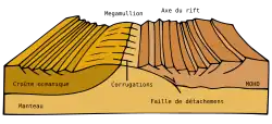 Les mégamullions se forment au niveau des zones d'expansion océanique, lorsque la tectonique est dominante: Il y a mise en place d'une faille de détachement qui dénude littéralement la croûte océanique profonde et y crée des striations nommées "corrugations" (le terme "mullion" est d'ailleurs emprunté à l'architecture pour désigner ces striations). Les géophysiciens penchent actuellement vers une hypothèse selon laquelle un taux minimum d'activité magmatique serait requis pour la formation de telles structures.