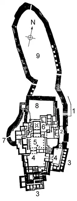 Le mégaron mycénien se compose d'un porche (αἴθουσα / aithousa), d'un vestibule (πϱόδομος / pródomos)[5] et d'une grande salle abritant un foyer central et un trône. Le porche donne sur une cour à laquelle on accède par un portail ornemental.