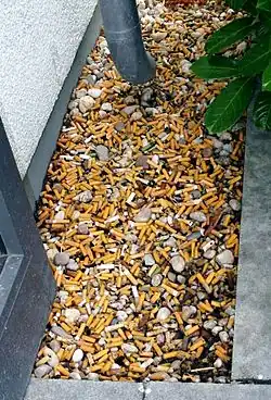 - L'interdiction de fumer dans l'espace public intérieur ou dans les aires de jeux pour enfant ont fait que les fumeurs sont plus nombreux à fumer dehors, où ils refuseraient ou négligeraient de faire quelques pas vers le cendrier le plus proche ou d'utiliser un cendrier portatif[33] (hypothèse périodiquement évoquée mais qui reste non testée)[34]. Selon l'ONG Keep Britain Tidy, après l'interdiction de fumer dans les espaces publics intérieurs (en 2007) le nombre de mégots trouvés dehors a augmenté de 43 % dans le pays[6]. Dans certains contextes (centre-ville...), le nombre de cendriers présents est l'un des facteurs contextuels prédicteurs du nombre de mégots jetés au sol[35].