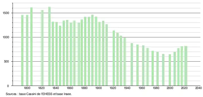 L'évolution du nombre d'habitants est connue à travers les recensements de la population effectués dans la commune depuis 1793. Pour les communes de moins de 10 000 habitants, une enquête de recensement portant sur toute la population est réalisée tous les cinq ans, les populations de référence des années intermédiaires étant quant à elles estimées par interpolation ou extrapolation[32]. Pour la commune, le premier recensement exhaustif entrant dans le cadre du nouveau dispositif a été réalisé en 2006[33].