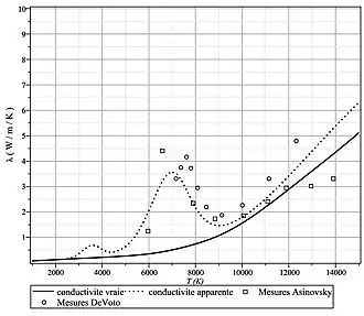 Conductivités de l'air à pression normale. Le premier pic correspond à la dissociation de l'oxygène et la formation de NO, le second à la dissociation de l'azote.