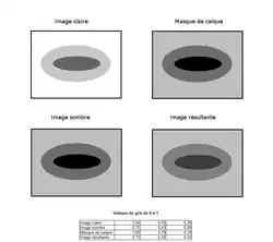 Lors de sa création le masque est uniformément blanc, ce qui signifie qu'il conserve intégralement l'opacité du calque supérieur. Un coup de pinceau gris crée localement une transparence partielle d'autant plus forte que le gris est plus foncé. Plus précisément, la valeur notée de l'opacité du calque supérieur transforme la valeur C d'un pixel de l'image claire, la valeur S du pixel correspondant de l'image sombre et la valeur M du pixel correspondant du masque selon la formule (voir par exemple Alpha blending) :