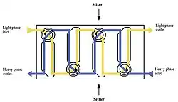 Une chambre de mélange contient un agitateur mécanique qui apporte un contact intime à la solution d'alimentation et au solvant d'extraction pour effectuer le transfert du ou des solutés. L'agitateur mécanique est équipé d'un moteur qui entraîne une turbine de mélange et de pompage. Cette turbine amène les deux phases, les mélange et transfère l'émulsion formée au décanteur. Le mélangeur peut comporter un ou plusieurs étages de réservoirs de mélange. Les mélangeurs de laboratoire communs se composent d'un seul étage de mélange alors que les mélangeurs industriels peuvent comporter jusqu'à trois étages de mélange où chaque étage effectue une action combinée de pompage et de mélange. L'utilisation de plusieurs étages permet un temps d'interaction plus long[1].