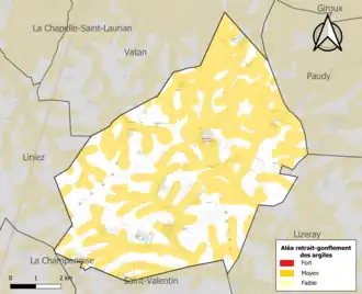 Le retrait-gonflement des sols argileux est susceptible d'engendrer des dommages importants aux bâtiments en cas d’alternance de périodes de sécheresse et de pluie. 59,1 % de la superficie communale est en aléa moyen ou fort (84,7 % au niveau départemental et 48,5 % au niveau national). Sur les 89 bâtiments dénombrés sur la commune en 2019, 54 sont en aléa moyen ou fort, soit 61 %, à comparer aux 86 % au niveau départemental et 54 % au niveau national. Une cartographie de l'exposition du territoire national au retrait gonflement des sols argileux est disponible sur le site du BRGM[20],[21].