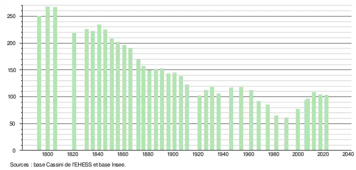 L'évolution du nombre d'habitants est connue à travers les recensements de la population effectués dans la commune depuis 1793. Pour les communes de moins de 10 000 habitants, une enquête de recensement portant sur toute la population est réalisée tous les cinq ans, les populations de référence des années intermédiaires étant quant à elles estimées par interpolation ou extrapolation[26]. Pour la commune, le premier recensement exhaustif entrant dans le cadre du nouveau dispositif a été réalisé en 2007[27].