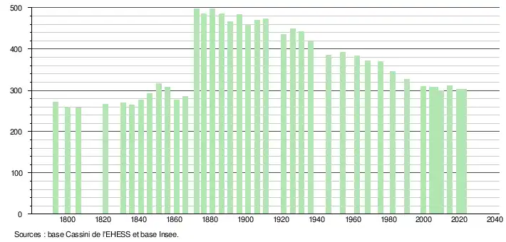 L'évolution du nombre d'habitants est connue à travers les recensements de la population effectués dans la commune depuis 1793. Pour les communes de moins de 10 000 habitants, une enquête de recensement portant sur toute la population est réalisée tous les cinq ans, les populations de référence des années intermédiaires étant quant à elles estimées par interpolation ou extrapolation[31]. Pour la commune, le premier recensement exhaustif entrant dans le cadre du nouveau dispositif a été réalisé en 2004[32].