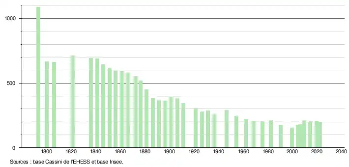 L'évolution du nombre d'habitants est connue à travers les recensements de la population effectués dans la commune depuis 1793. Pour les communes de moins de 10 000 habitants, une enquête de recensement portant sur toute la population est réalisée tous les cinq ans, les populations de référence des années intermédiaires étant quant à elles estimées par interpolation ou extrapolation[27]. Pour la commune, le premier recensement exhaustif entrant dans le cadre du nouveau dispositif a été réalisé en 2004[28].