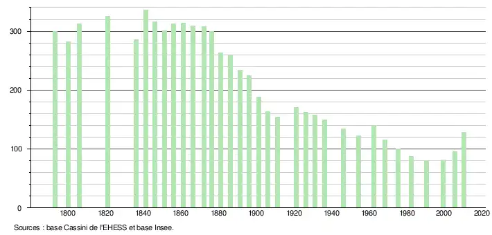 - ↑ Dans le tableau des recensements et le graphique, par convention dans Wikipédia, le principe a été retenu, pour les populations légales postérieures à 1999 de n’afficher dans le tableau des recensements et le graphique que les populations correspondant à l'année 2006, première population légale publiée calculée conformément aux concepts définis dans le décret no 2003-485 du 5 juin 2003, et les années correspondant à une enquête exhaustive de recensement pour les communes de moins de 10 000 habitants, ainsi que la dernière population légale publiée par l’Insee.