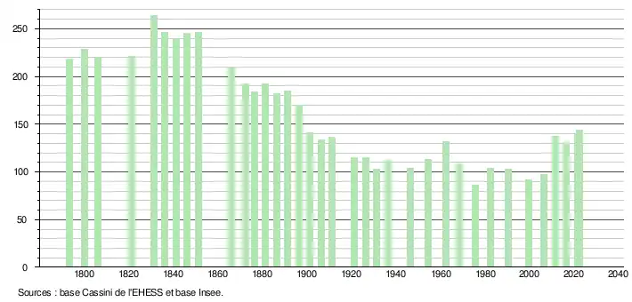L'évolution du nombre d'habitants est connue à travers les recensements de la population effectués dans la commune depuis 1793. Pour les communes de moins de 10 000 habitants, une enquête de recensement portant sur toute la population est réalisée tous les cinq ans, les populations de référence des années intermédiaires étant quant à elles estimées par interpolation ou extrapolation[16]. Pour la commune, le premier recensement exhaustif entrant dans le cadre du nouveau dispositif a été réalisé en 2006[17].