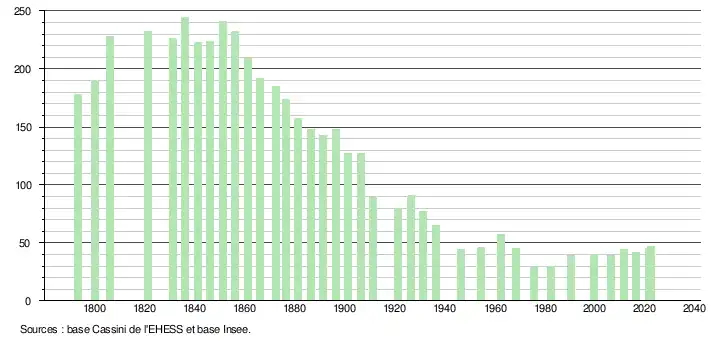L'évolution du nombre d'habitants est connue à travers les recensements de la population effectués dans la commune depuis 1793. Pour les communes de moins de 10000habitants, une enquête de recensement portant sur toute la population est réalisée tous les cinqans, les populations de référence des années intermédiaires étant quant à elles estimées par interpolation ou extrapolation[19]. Pour la commune, le premier recensement exhaustif entrant dans le cadre du nouveau dispositif a été réalisé en 2006[20].