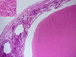 Autopsie d'un patient atteint de méningite à pneumocoque montrant un infiltrat inflammatoire de la pie mère composé de neutrophiles.