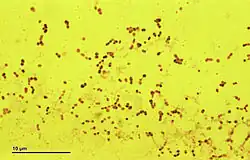 Observation au microscope d'une culture avec coloration de Gram, mettant en évidence une infection à méningocoque (diplocoques Gram négatif).