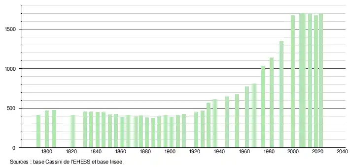 L'évolution du nombre d'habitants est connue à travers les recensements de la population effectués dans la commune depuis 1793. Pour les communes de moins de 10 000 habitants, une enquête de recensement portant sur toute la population est réalisée tous les cinq ans, les populations de référence des années intermédiaires étant quant à elles estimées par interpolation ou extrapolation[48]. Pour la commune, le premier recensement exhaustif entrant dans le cadre du nouveau dispositif a été réalisé en 2008[49].