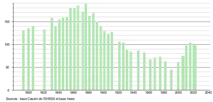 | L'évolution du nombre d'habitants est connue à travers les recensements de la population effectués dans la commune depuis 1793. Pour les communes de moins de 10 000 habitants, une enquête de recensement portant sur toute la population est réalisée tous les cinq ans, les populations de référence des années intermédiaires étant quant à elles estimées par interpolation ou extrapolation[41]. Pour la commune, le premier recensement exhaustif entrant dans le cadre du nouveau dispositif a été réalisé en 2005[42]. En 2022, la commune comptait 97 habitants[Note 3], en évolution de −9,35 % par rapport à 2016 (Ariège : +1,48 %, France hors Mayotte : +2,11 %). |