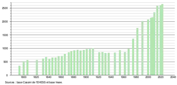 L'évolution du nombre d'habitants est connue à travers les recensements de la population effectués dans la commune depuis 1793. Pour les communes de moins de 10 000 habitants, une enquête de recensement portant sur toute la population est réalisée tous les cinq ans, les populations de référence des années intermédiaires étant quant à elles estimées par interpolation ou extrapolation[30]. Pour la commune, le premier recensement exhaustif entrant dans le cadre du nouveau dispositif a été réalisé en 2004[31].
