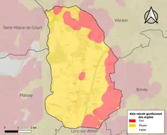 La commune est vulnérable au risque de mouvements de terrains constitué principalement du retrait-gonflement des sols argileux[16]. Cet aléa est susceptible d'engendrer des dommages importants aux bâtiments en cas d’alternance de périodes de sécheresse et de pluie. La totalité de la commune est en aléa moyen ou fort (90 % au niveau départemental et 48,5 % au niveau national). Sur les 1 138 bâtiments dénombrés sur la commune en 2019, 1138 sont en aléa moyen ou fort, soit 100 %, à comparer aux 83 % au niveau départemental et 54 % au niveau national. Une cartographie de l'exposition du territoire national au retrait gonflement des sols argileux est disponible sur le site du BRGM[17],[Carte 2].