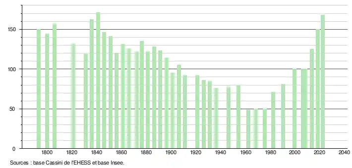 L'évolution du nombre d'habitants est connue à travers les recensements de la population effectués dans la commune depuis 1793. Pour les communes de moins de 10 000 habitants, une enquête de recensement portant sur toute la population est réalisée tous les cinq ans, les populations de référence des années intermédiaires étant quant à elles estimées par interpolation ou extrapolation[16]. Pour la commune, le premier recensement exhaustif entrant dans le cadre du nouveau dispositif a été réalisé en 2008[17].