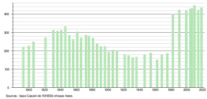 L'évolution du nombre d'habitants est connue à travers les recensements de la population effectués dans la commune depuis 1793. Pour les communes de moins de 10 000 habitants, une enquête de recensement portant sur toute la population est réalisée tous les cinq ans, les populations de référence des années intermédiaires étant quant à elles estimées par interpolation ou extrapolation[14]. Pour la commune, le premier recensement exhaustif entrant dans le cadre du nouveau dispositif a été réalisé en 2004[15].