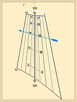 Des formules simples de gnomonique[N 4] permettent d'esquisser le schéma d'une méridienne théorique :