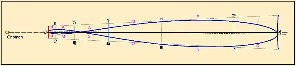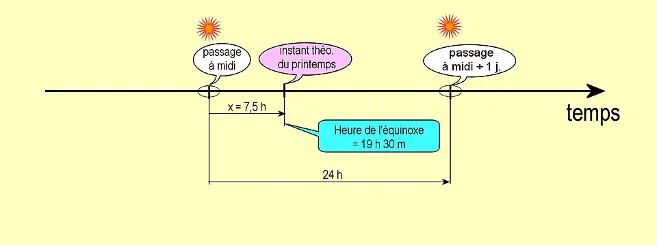 - ↑ L'instant des solstices, de moindre intérêt, n'est pratiquement pas possible à déterminer graphiquement, la variation de la déclinaison solaire vers ces dates étant imperceptible.