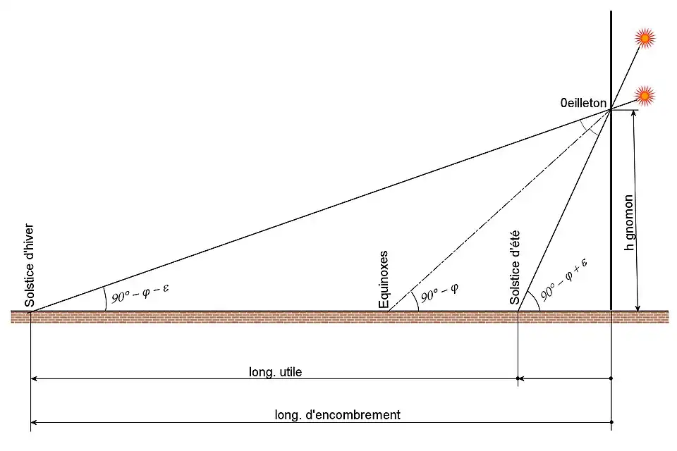 φ et ε étant connus, on peut par exemple, en se donnant la hauteur du gnomon, en déduire les longueurs au sol de la méridienne et vice-versa.