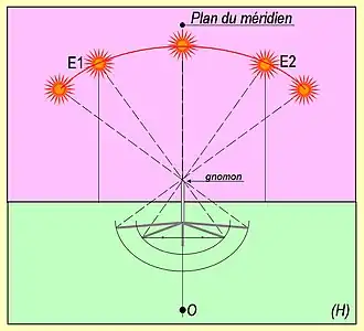 Il est bien connu que l'ombre d'un gnomon sur un sol horizontal est la plus courte à midi, mais entre 11 h et 13 h, cette longueur est pratiquement constante, d'où une grande incertitude dans le tracé de la ligne méridienne qui joint le pied du gnomon à l'extrémité de l'ombre minimum. Une méthode géométrique simple, relativement précise, se substitua très tôt à la méthode originelle.