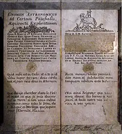 L'inscription à la base de l'obélisque mentionne Charles-Claude Le Monnier, ainsi que la mission du gnomon en latin: Ad Certam Paschalis Æquinoctii Explorationem (« pour déterminer avec précision l'équinoxe de Pâques »)[6].