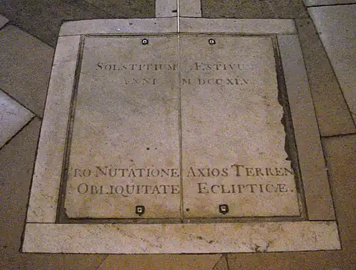 Le Monnier a en outre utilisé le gnomon à partir de 1744 pour établir les variations de l'écliptique ou les variations de l'obliquité de l'axe de la Terre[6]. Le projet est inscrit sur la plaque de l'extrémité sud du méridien, dans le transept sud : « Pro nutatione axios terren. Obliquitate eclipticae » (« pour la nutation de l'axe de la terre et l'obliquité de l'écliptique »)[6].