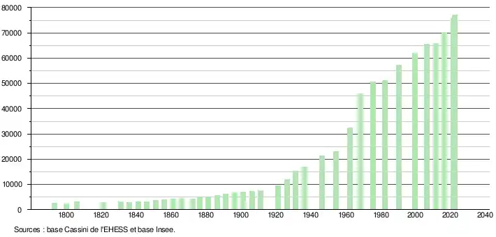 4. Par convention dans Wikipédia, le principe a été retenu de n’afficher dans le tableau des recensements et le graphique, pour les populations de référence postérieures à 1999, que les populations correspondant à une enquête exhaustive de recensement pour les communes de moins de 10 000 habitants, et que les populations des années 2006, 2011, 2016, etc. pour les communes de plus de 10 000 habitants, ainsi que la dernière population de référence publiée par l’Insee pour l'ensemble des communes.